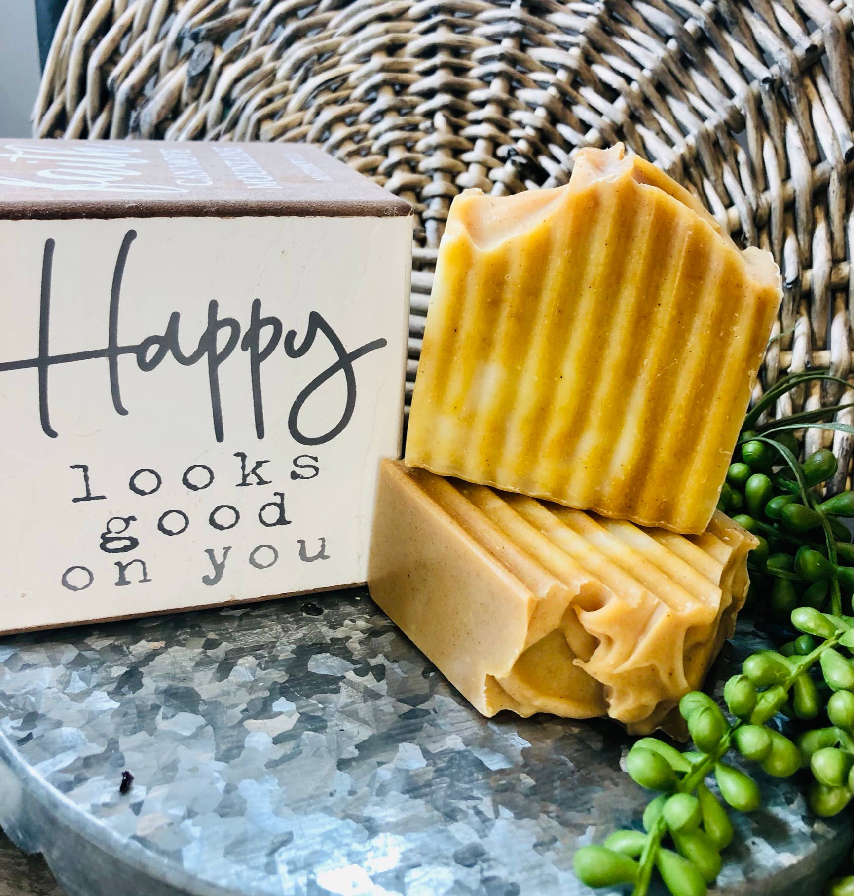 Happiness Handmade Natural Soap. Happy scent notes of: Poppy, Lily, Magnolia, & the healing power of turmeric powder.