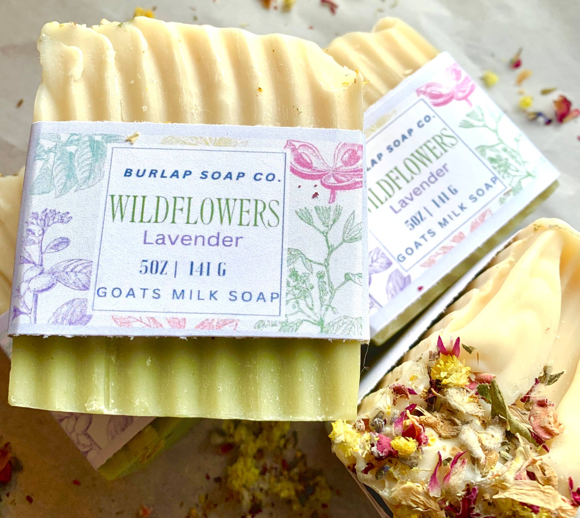 Ingredients: Goats milk, Olive oil, Coconut oil, Palm oil, Castor oil, Rice bran oil, Avocado oil, Colloidal oats, Green clay, Alfalfa powder, Distilled water, lavender essential oil, dried wildflowers